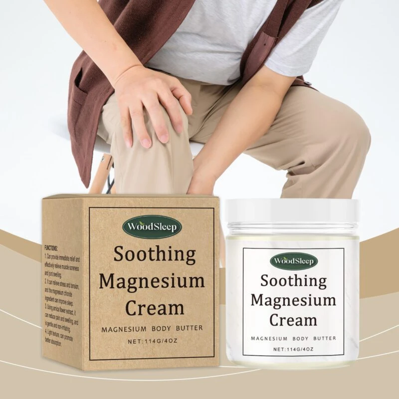 WoodSleep Body Care Magnesium Cream contains glycerin, mineral oil, and glycerin stearate. Formulated to help soothe joint discomfort and support mobility with long-lasting hydration.