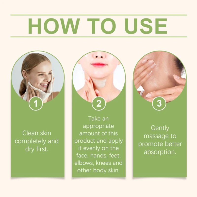 - Apply evenly to face, hands, feet, elbows, knees, or other areas