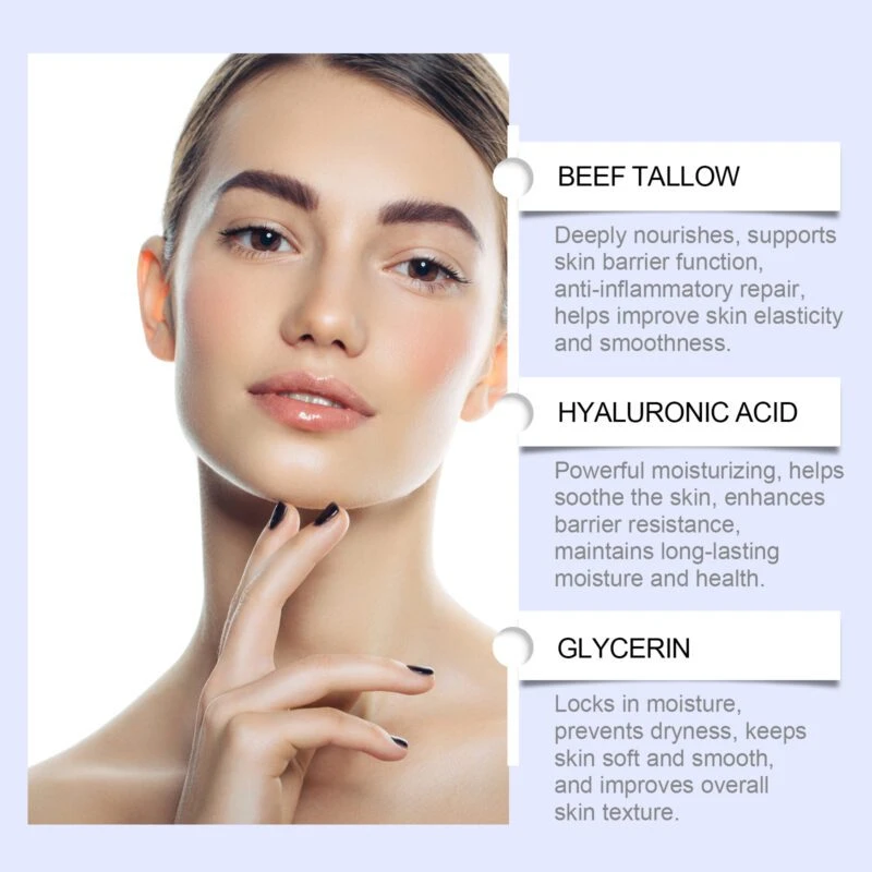 Our grass-fed butter cream contains triethanolamine, sodium hyaluronate, and tallow. It deeply nourishes the skin and supports the skin barrier function, helping protect against environmental stressors for healthier-looking skin.