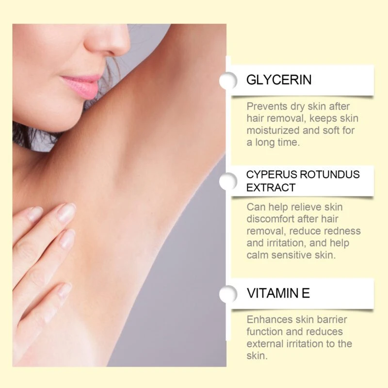Our balsamic hair removal treatment oil contains glycerin, balsamic fruit extract, and aloe vera leaf extract. It deeply nourishes the skin and helps relieve dryness and discomfort after hair removal.