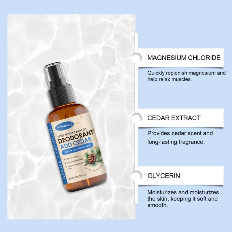 Our Woodsleep Magnesium Spray (Cedar) contains magnesium chloride and cedar extract. This topical spray is designed for easy skin application to support magnesium replenishment.