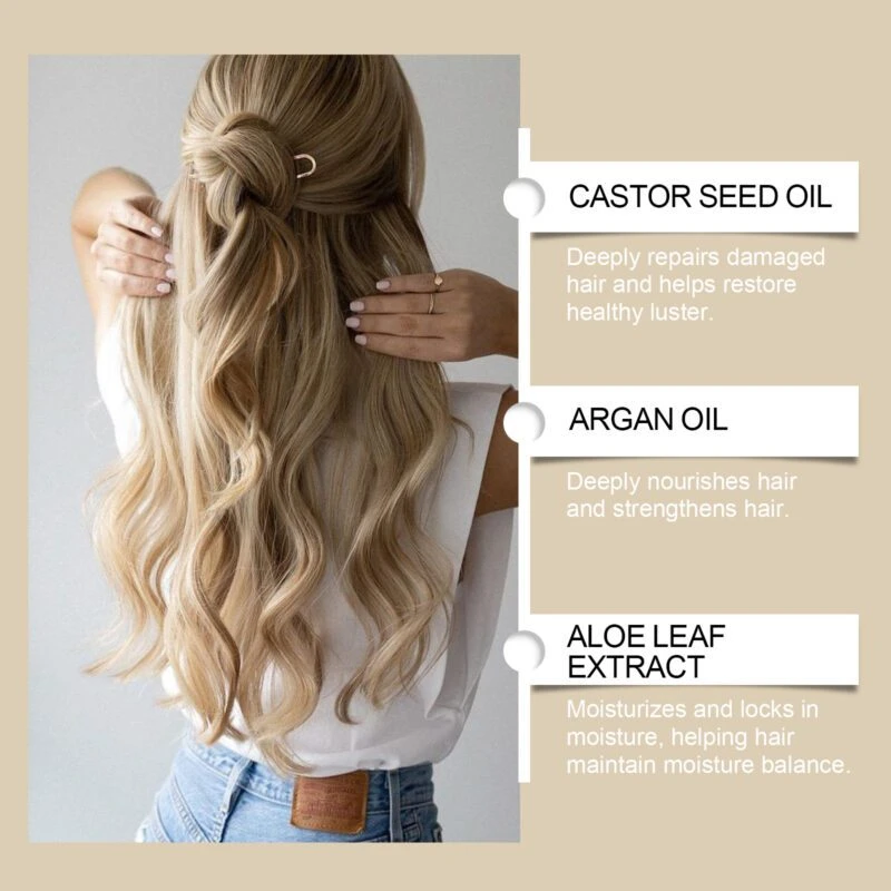 Our moisturizing hair mask features castor seed oil, argan oil, and aloe vera leaf extract to deeply nourish damaged hair. It helps restore a healthy shine while reducing breakage and split ends.