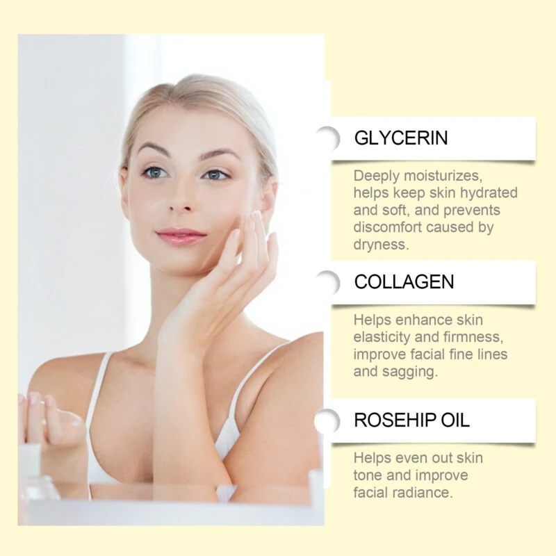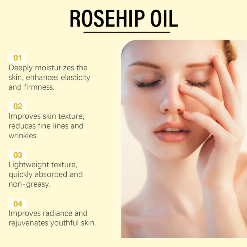 Our premium rosehip oil is enriched with glycerin and collagen to help improve skin firmness and reduce the appearance of fine lines. This lightweight formula leaves skin feeling soft, smooth, and revitalized.