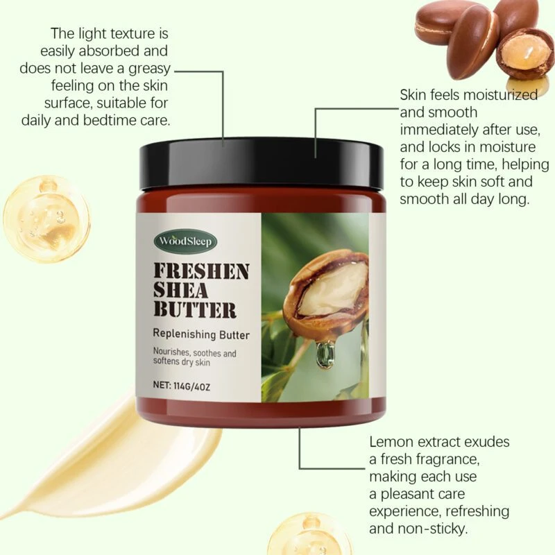 WoodSleep Shea Butter Body Cream is formulated with glycerin, shea butter, olive oil, and lemon essence. This daily moisturizer deeply hydrates skin to lock in moisture, prevent dryness, peeling, and roughness while maintaining softness.