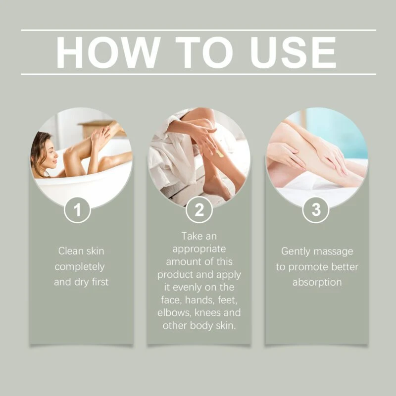 - Apply evenly to face, hands, feet, elbows, or knees