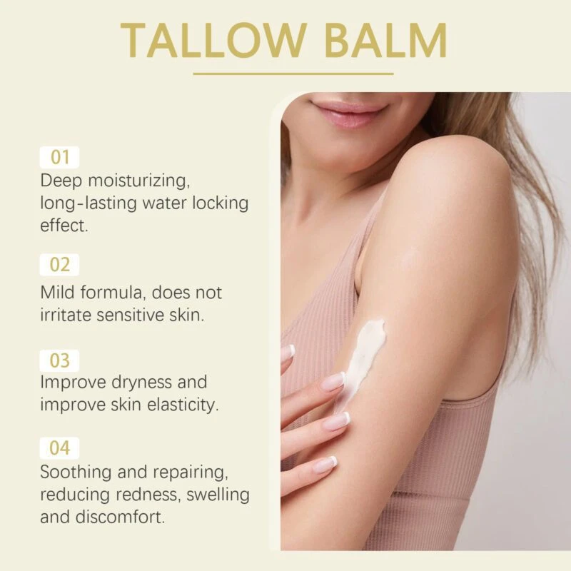 Our tallow multifunctional skin moisturizer contains glycerin and glycerin stearate. It helps relieve skin discomfort, support barrier repair, and reduce redness. Free of irritating ingredients, it’s suitable for all skin types including sensitive skin.