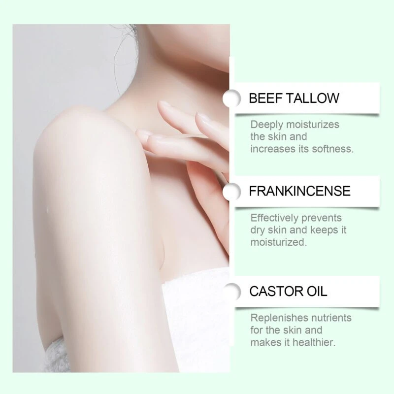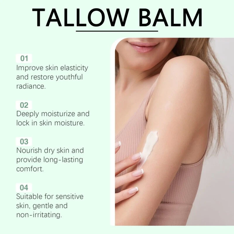 Our tallow-based moisturizer with glycerin and mineral oil provides deep hydration to soothe dry skin. It helps maintain skin elasticity while enhancing radiance and improving overall texture for a smoother appearance.