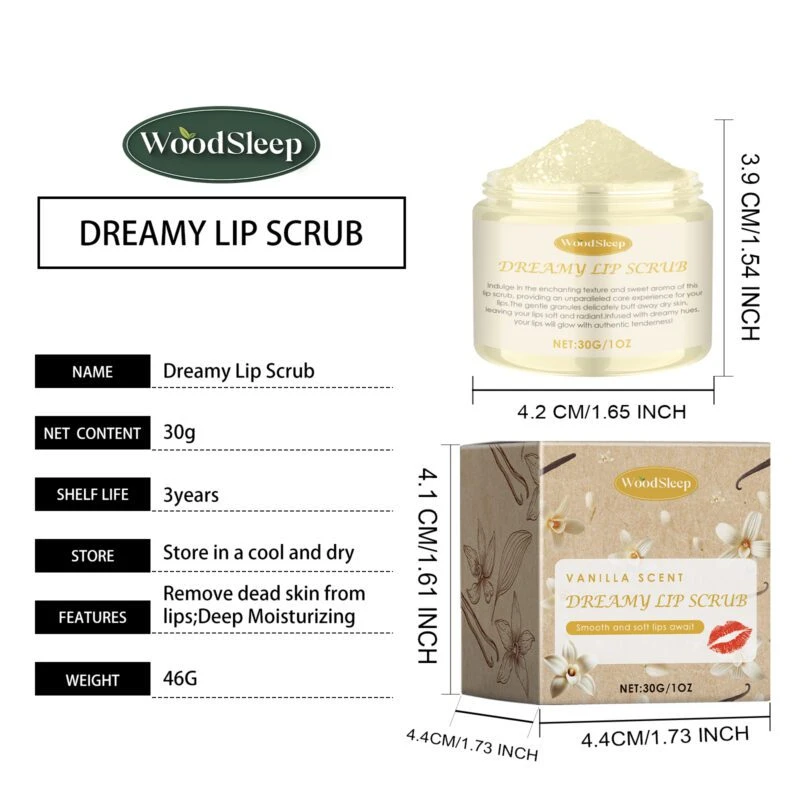 Woodsleep Vanilla Lip Scrub features natural ingredients including Jojoba seed oil, vanilla fruit extract, and lactic acid. This gentle formula exfoliates dry skin, helping improve lip texture and leaving lips feeling soft and smooth.